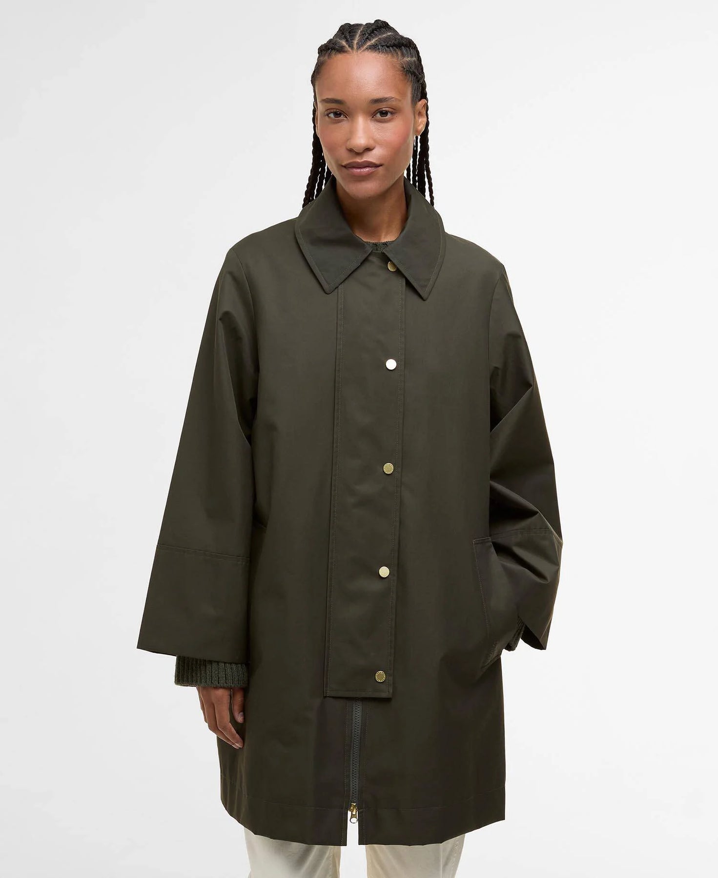 The Barbour Fia Showerproof Jacket offers a unique detachable cape design with button-off fastening at the neck. Featuring a large placket with studded closure, spacious welt pockets and a tartan-lined back buggy, it combines practicality with signature style. Its relaxed fit ensures comfort, making it a standout choice in your outerwear collection.