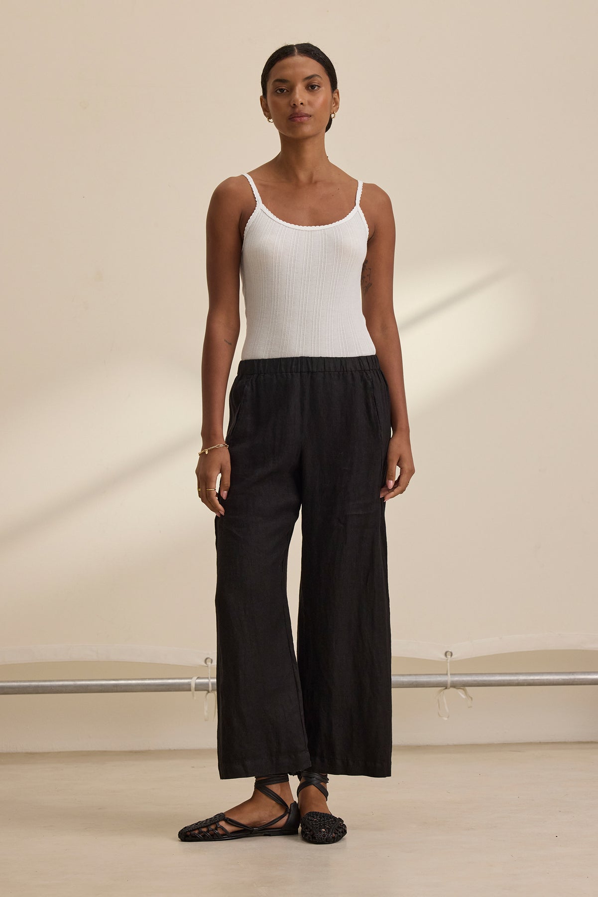 The perfect pant. Crafted from a lightweight linen woven, these pull-on trousers have an elastic waist, a relaxed leg with a slight ankle crop, and the perfect ease of a gorgeous warm weather day.