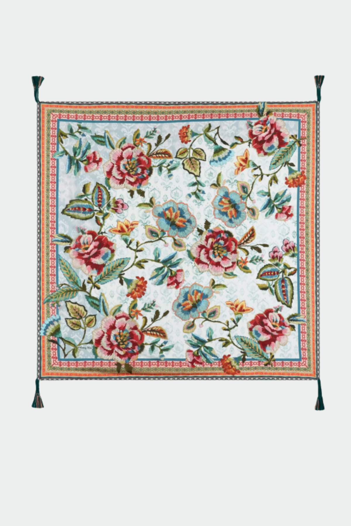 Crafted from luxurious 100% silk, the Gillian Silk Scarf is a rich colorful accessory. Featuring a vibrant floral motif including a variety of sizes and color of blooms, this unique scarf is bordered with bold color enhanced with eye-catching lines of pattern. Wear over your hair on windy days to maintain a perfect coiffed style.